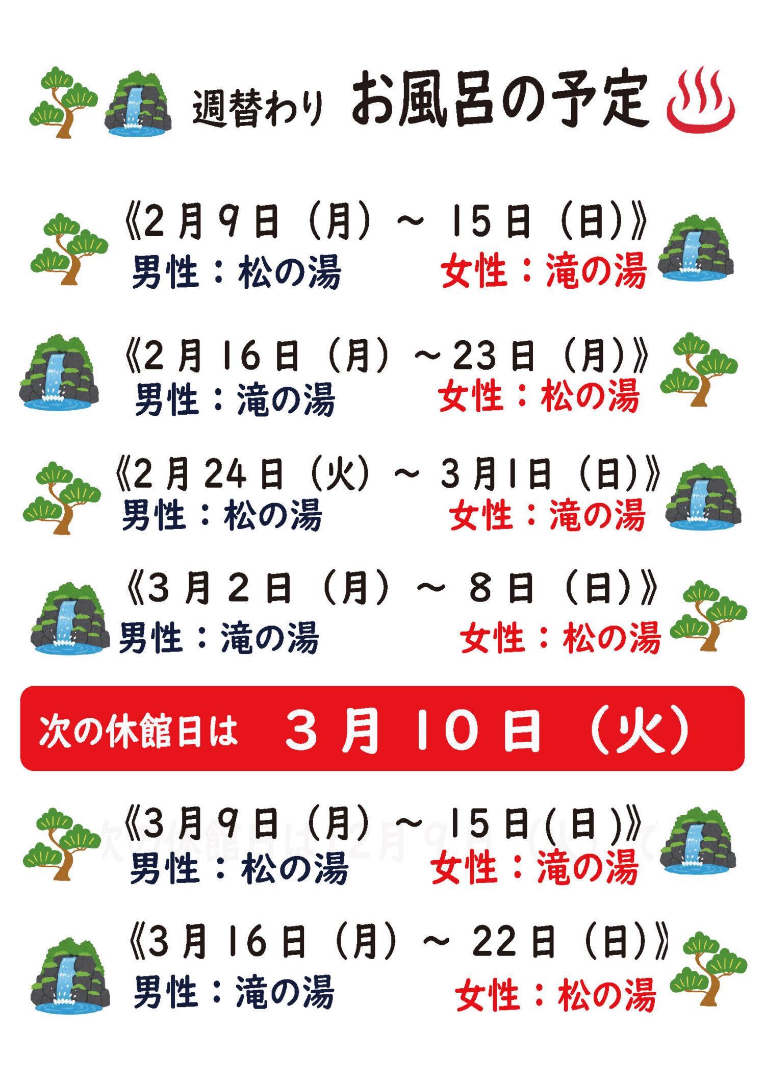 【上方温泉一休 京都本館】週替わり お風呂の予定(2月9日~3月22日)